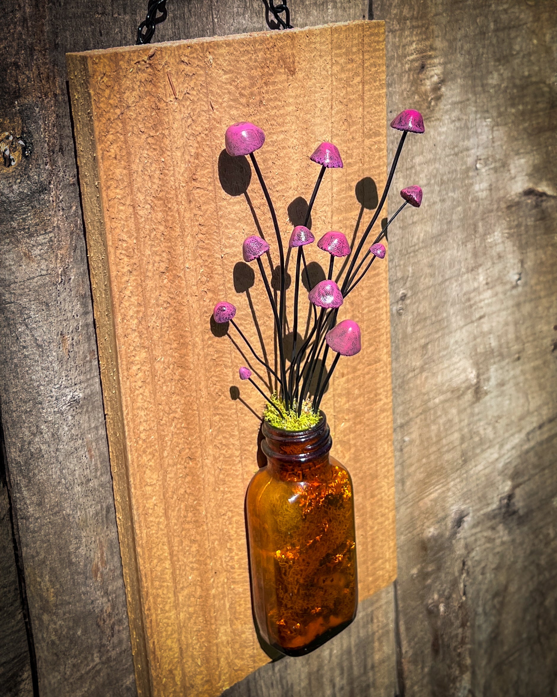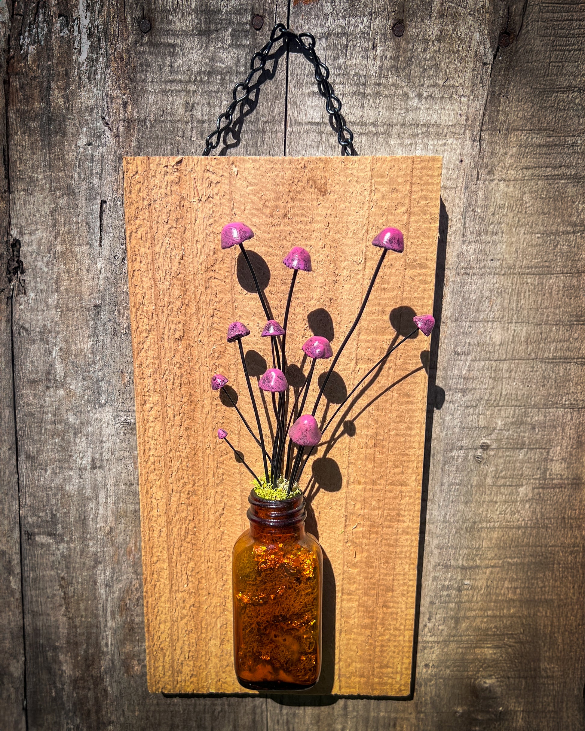 - Materials: Found amber glass bottle, preserved moss, polymer clay mushrooms, reclaimed wood, metal chain